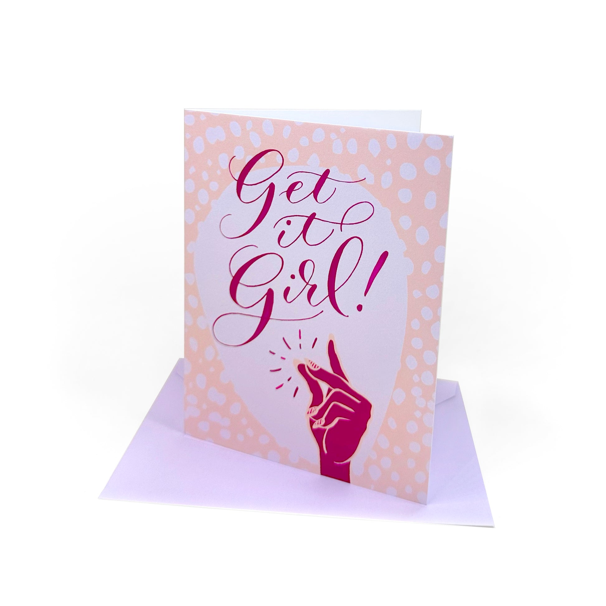 For big-ups, and celebrations, the ‘Get It Girl!’ card was crafted for life’s achievements, big or small. The sassy message — originally hand-lettered in pointed pen calligraphy — plus a playful illustration of fingers snapping makes this card exude confidence and enthusiasm. It’s ideal for celebrating milestones and victories, or motivating your girl for what’s ahead.