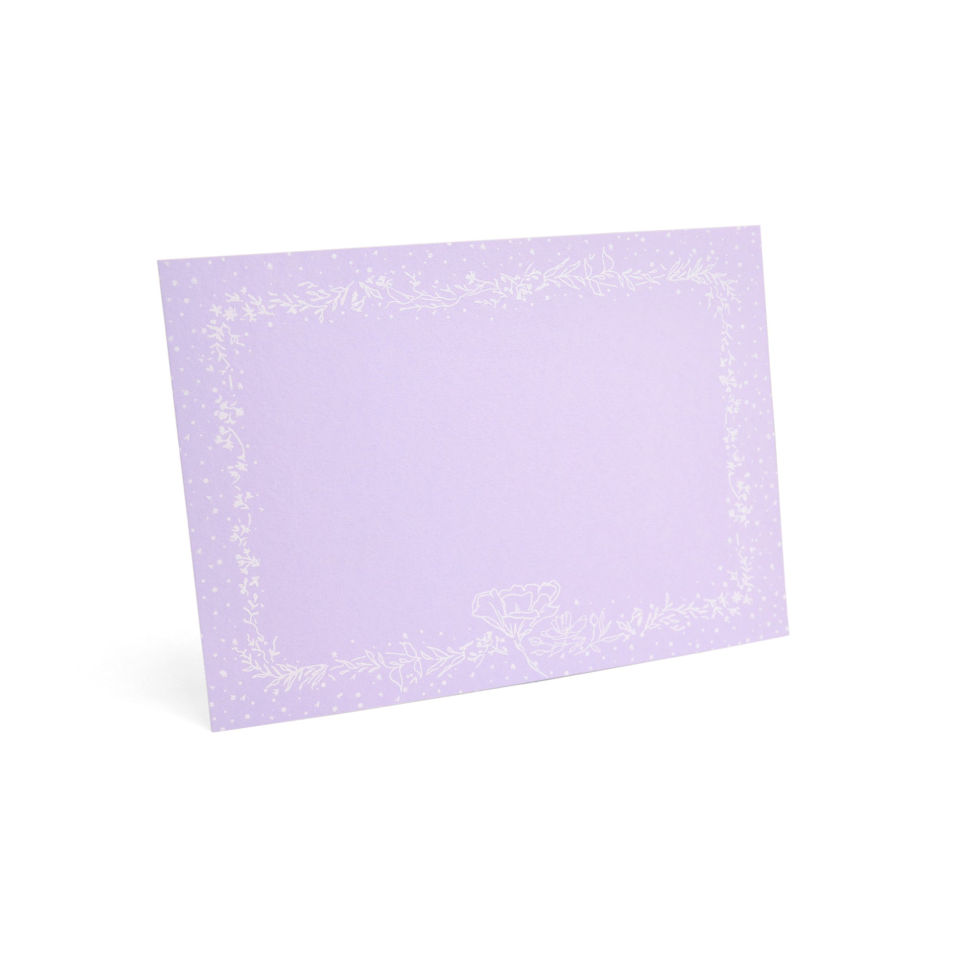 Experience the soothing Lavender ambiance, where a large bloom graces the bottom center of a frame of sprigs. The lavender-colored paper is accompanied by a lighter metallic euro flap envelope, completing this elegant and nature-inspired ensemble.