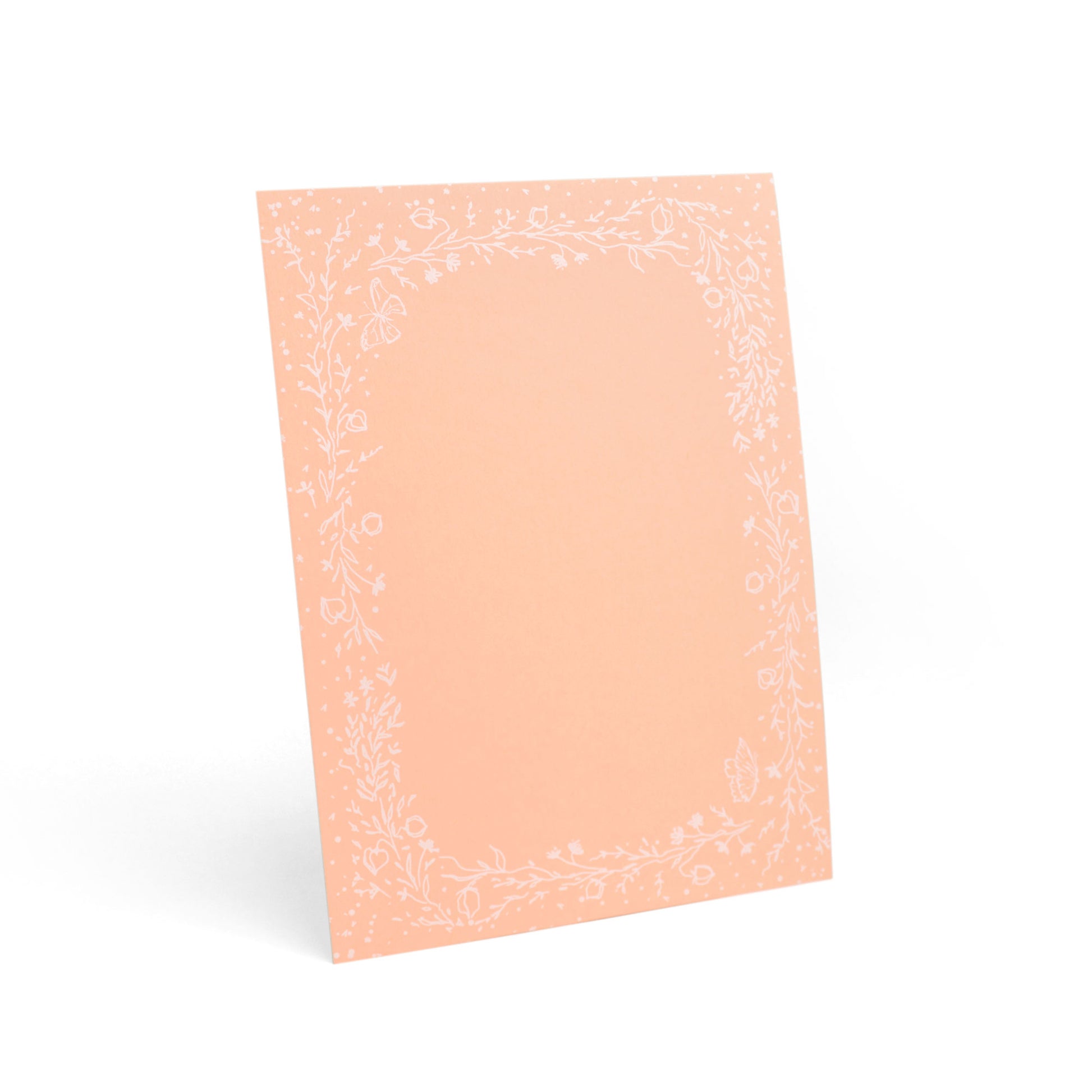 Revel in the warmth of Peach — my favorite color. The peachy paper features sprigs and two butterflies, creating a charming frame. Paired with a lighter metallic envelope in the same delightful hue.