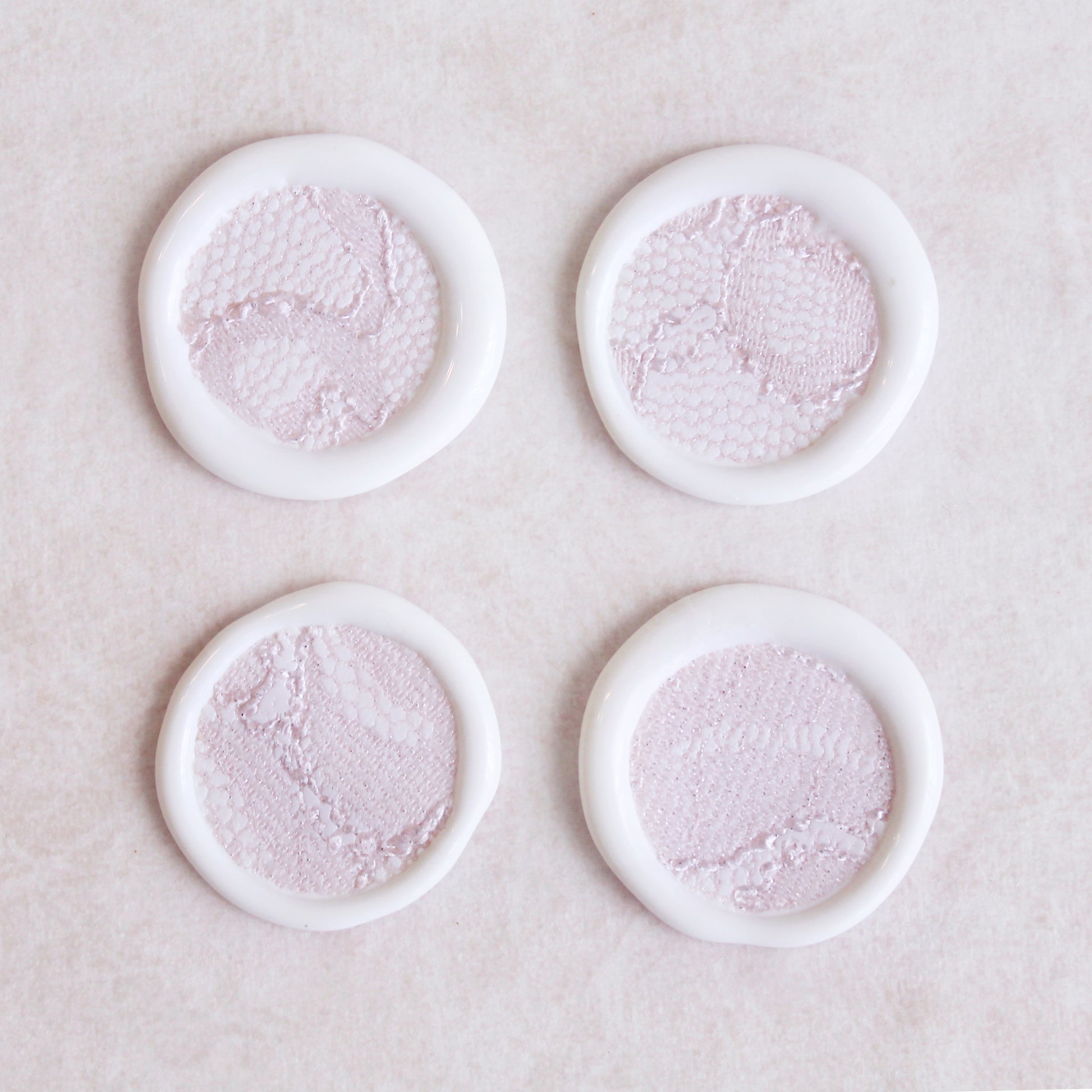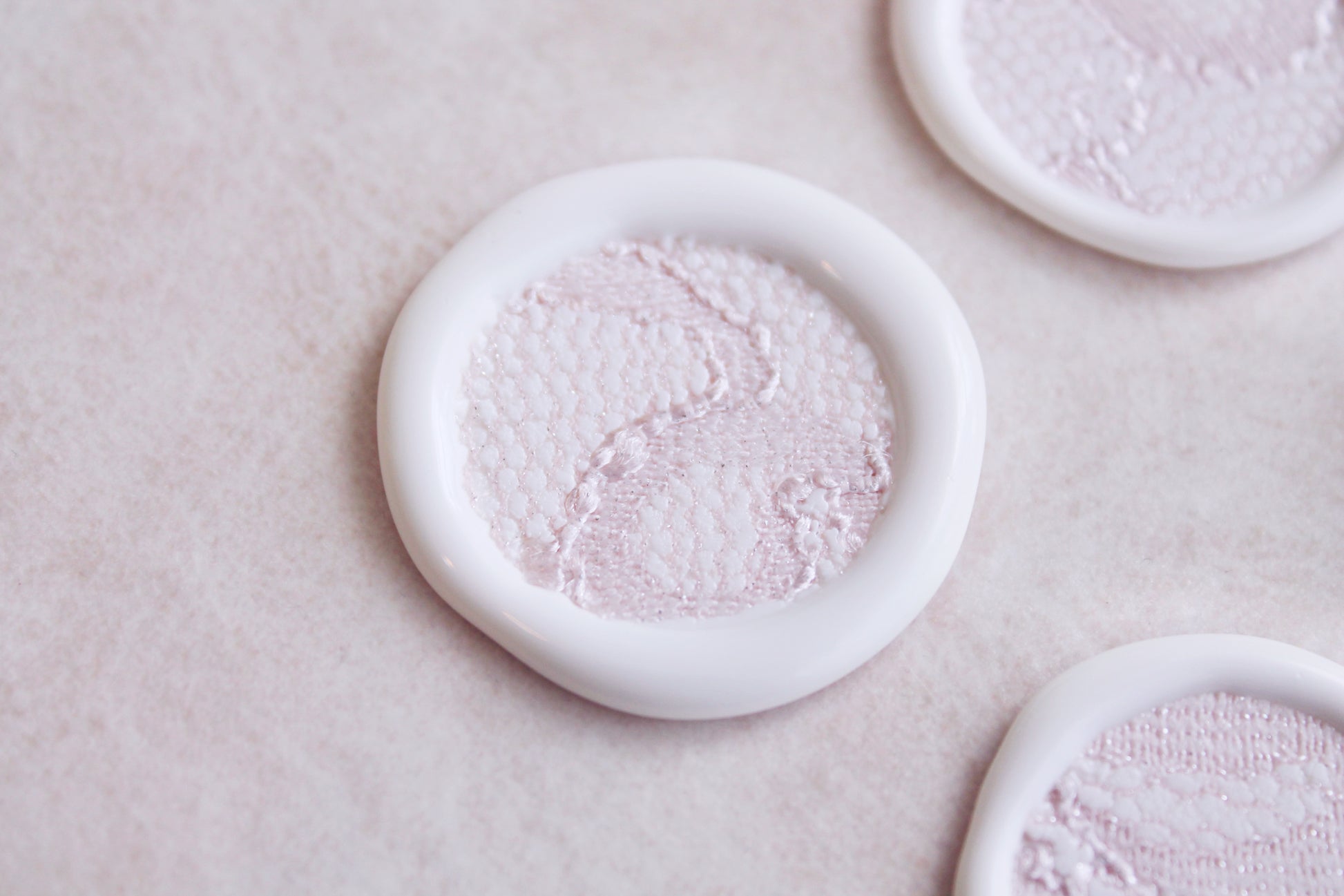 It's so sweet when an experiment goes right! These bright white wax seals have light blush lace fabric embedded on the surface. It creates a such beautifully delicate, and elegant touch to your paper crafting, gift wrapping and snail mail.