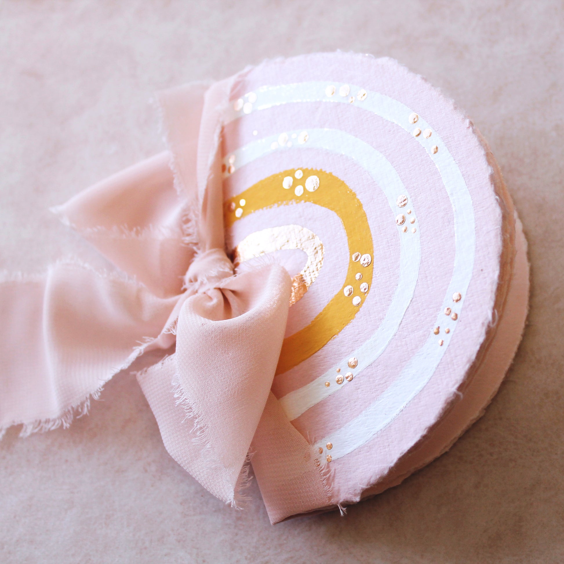 - Cover: Light rose pink handmade paper, made from recycled rag cotton, hand-painted with acrylic paints and embellished with metallic rose gold foil