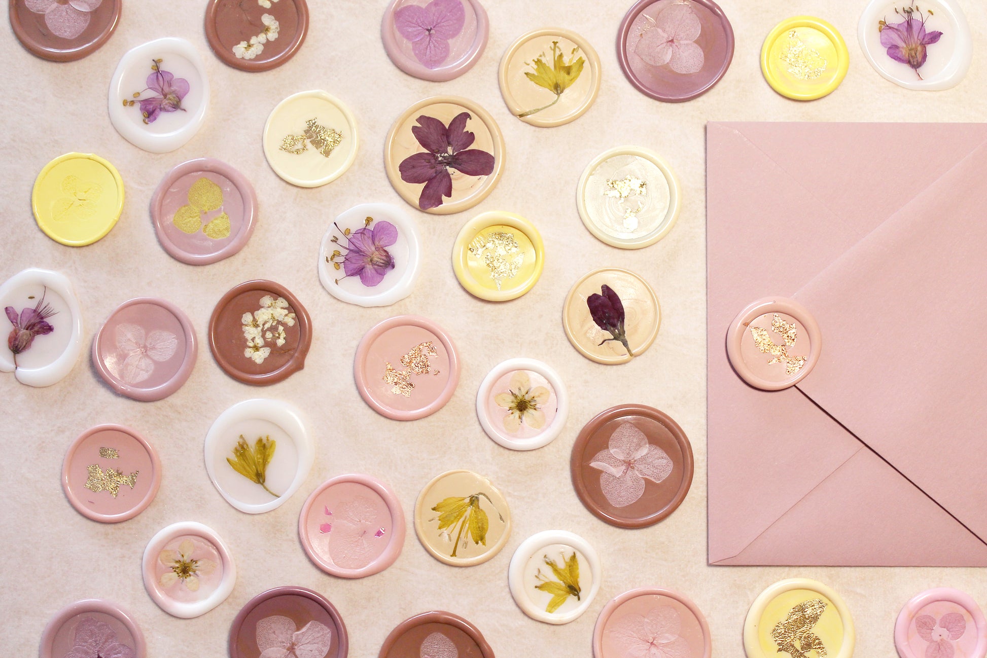 Hand-crafted wax seals made in a limited quantity. Random assorted sets are each unique and may include blooms and petals of preserved flowers and other embellishments pressed into sealing wax.