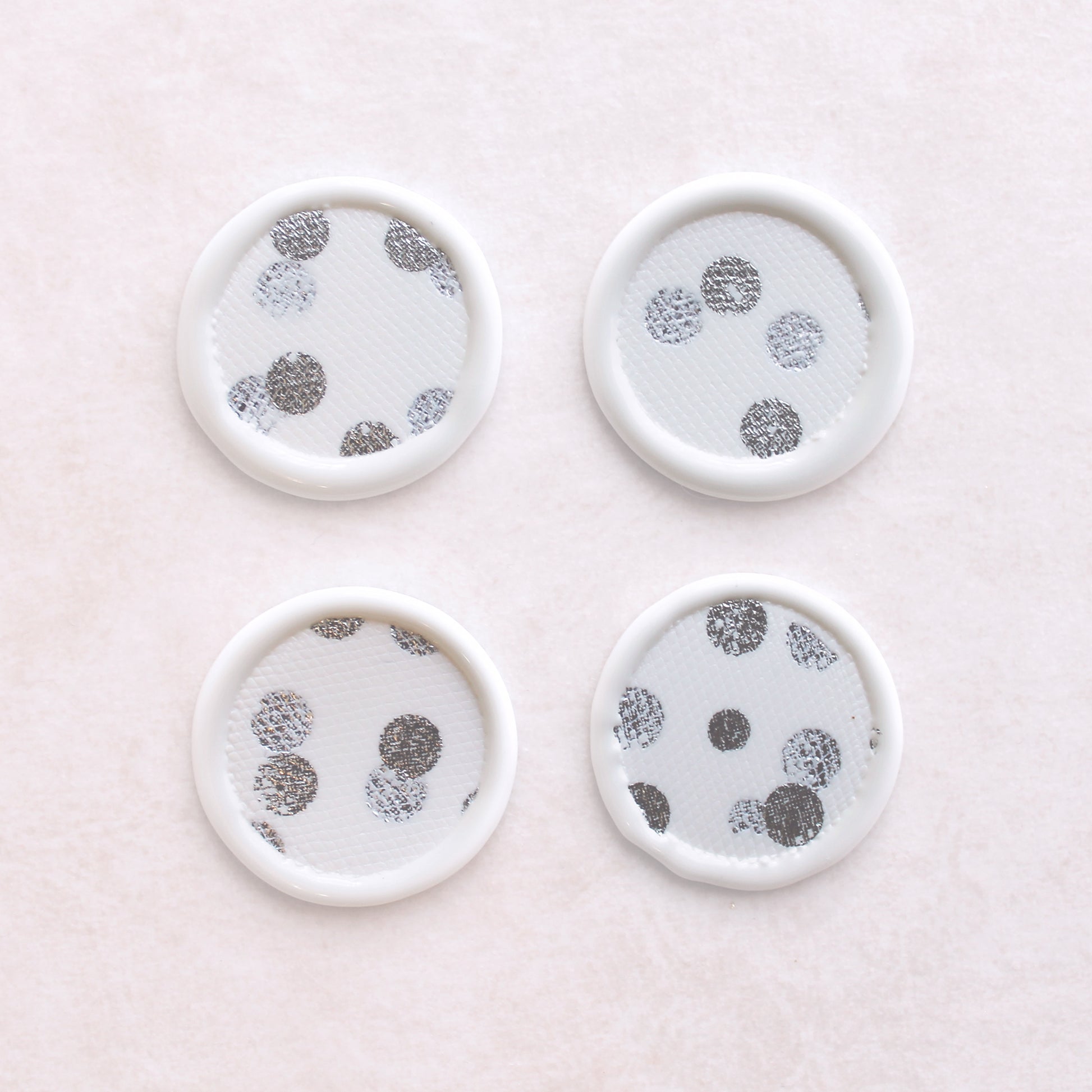 A perfect accent to your chic cards and gift wrapping, these bright white wax seals are embellished with metallic silver circles and a fine imprint of fabric.